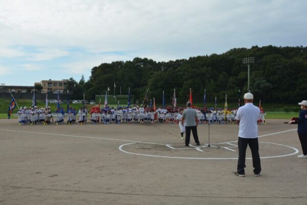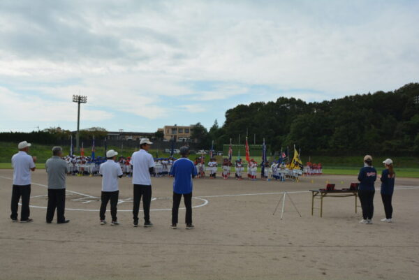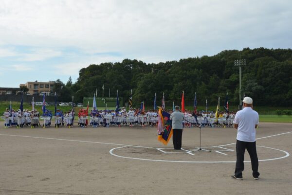 昨年の優勝チーム『岡山庭瀬シャークス』から優勝旗とトロフィーの返還。