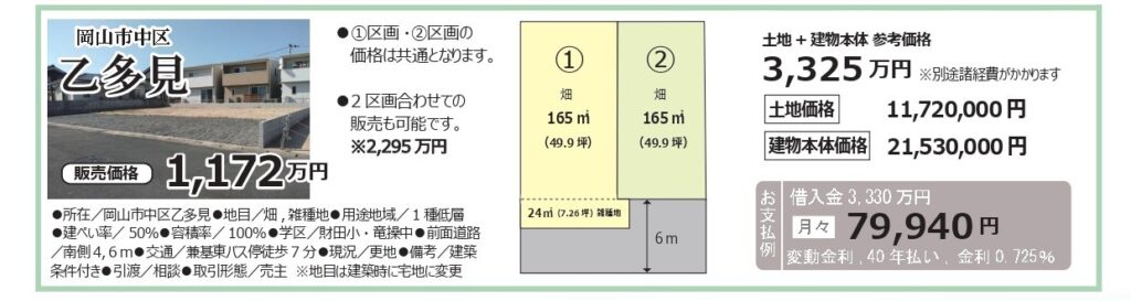 岡山市中区乙多見の分譲地を、2区画に分けて建築条件付きで販売!
