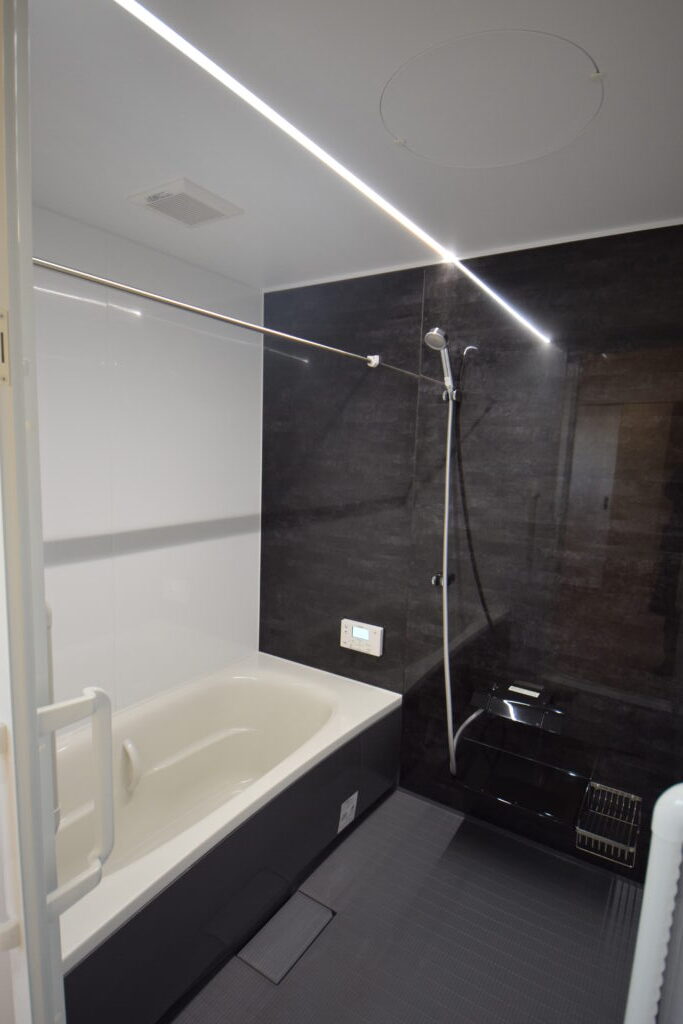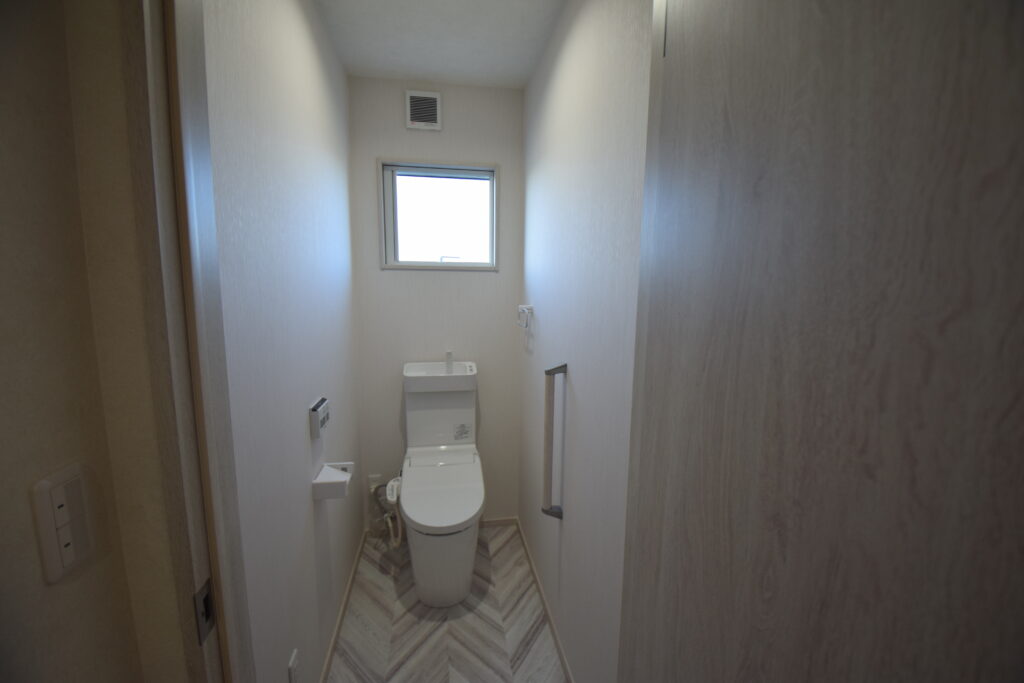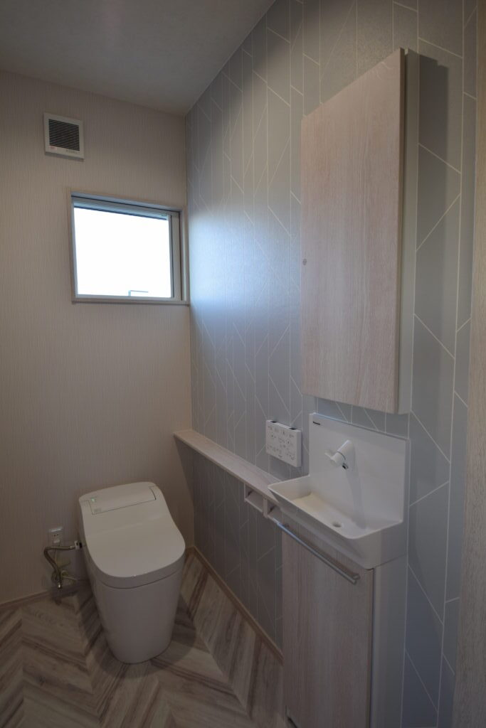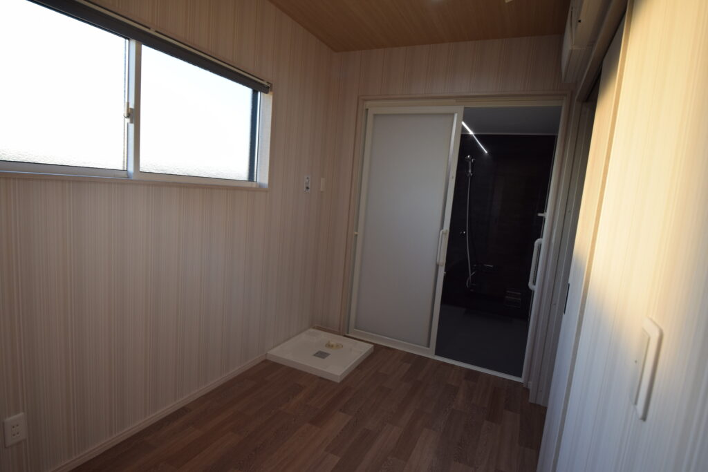 引戸の入口ドアに、足元の空いた造作洗面台などで、